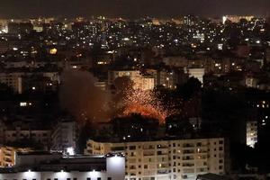 (250606) -- BEIRUT, 6 junio, 2025 (Xinhua) -- Imagen del 5 de junio de 2025 de llamas destellando tras un...