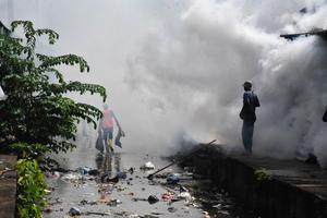 (250606) -- COLOMBO, 6 junio, 2025 (Xinhua) -- Trabajadores de la salud rocían desinfectantes en un área residencial como parte...