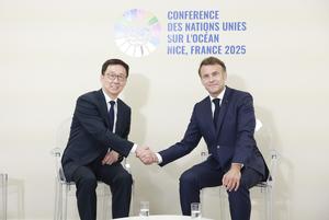 (250609) -- NIZA, 9 junio, 2025 (Xinhua) -- El vicepresidente chino, Han Zheng, se reúne con el presidente francés, Emmanuel...