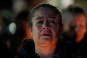 (250607) -- BOGOTA, 7 junio, 2025 (Xinhua) -- Una mujer reacciona en una velada con motivo del atentado del que...