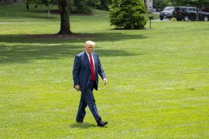 (250609) -- WASHINGTON, 9 junio, 2025 (Xinhua) -- El presidente de estadounidense, Donald Trump, camina por el jardín sur a...