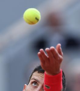 (250607) -- PARÍS, 7 junio, 2025 (Xinhua) -- Imagen del 6 de junio de 2025 de Novak Djokovic sirviendo la...