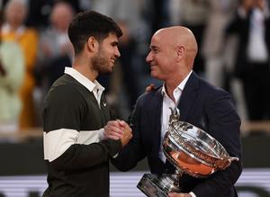 (250609) -- PARIS, 9 junio, 2025 (Xinhua) -- Imagen del 8 de junio de 2025 de Andre Agassi (d) presentando...
