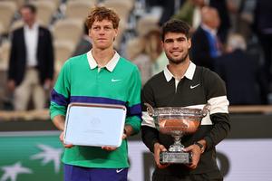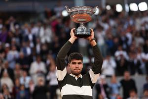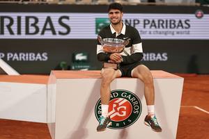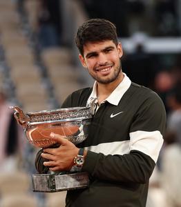 (250609) -- PARIS, 9 junio, 2025 (Xinhua) -- Imagen del 8 de junio de 2025 de Carlos Alcaraz posando con...