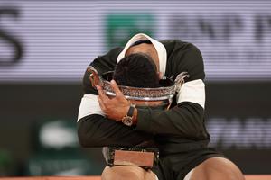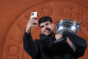 (250609) -- PARIS, 9 junio, 2025 (Xinhua) -- Imagen del 8 de junio de 2025 de Carlos Alcaraz tomándose una...