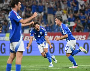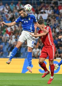 (250610) -- REGGIO EMILIA, 10 junio, 2025 (Xinhua) -- Imagen del 9 de junio de 2025 de Giacomo Raspadori (d),...