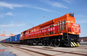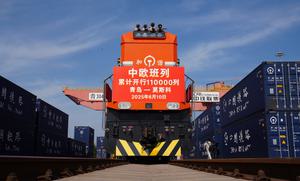 (250610) -- QINGDAO, 10 junio, 2025 (Xinhua) -- El tren de carga China-Europa número 110.000 con destino a Moscú, Rusia,...