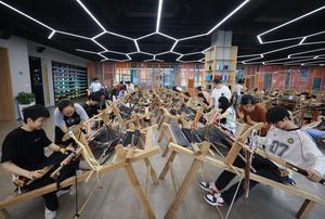 (250610) -- ZHANGJIAJIE, 10 junio, 2025 (Xinhua) -- Imagen del 9 de junio de 2025 de estudiantes universitarios intentando tejer...