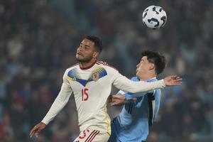 (250611) -- MONTEVIDEO, 11 junio, 2025 (Xinhua) -- Imagen del 10 de junio de 2025 del jugador Maximiliano Araújo (i),...