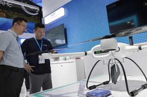 (250611) -- SHANGHAI, 11 junio, 2025 (Xinhua) -- Visitantes conversan junto a un dron capaz de tomar imágenes hiperespectrales durante...