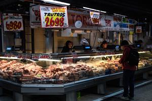 (250611) -- SANTIAGO, 11 junio, 2025 (Xinhua) -- Una persona realiza compras en una carnicería en el mercado La Vega...