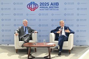 (250612) -- BEIJING, 12 junio, 2025 (Xinhua) -- Imagen del 11 de junio de 2025 de Ludger Schuknecht (d), vicepresidente y secretario corporativo del Banco Asiático de Inversión en Infraestructuras (BAII), hablando durante una conferencia de prensa para la décima reunión anual del BAII, en Beijing, capital de China. La décima reunión anual del BAII, en la que se espera la participación de más de 3.500 invitados de aproximadamente 100 países y regiones, se llevará a cabo del 24 al 26 de junio en Beijing. China será el país anfitrión de este evento. (Xinhua/Li Xin) (jg) (da) (vf)