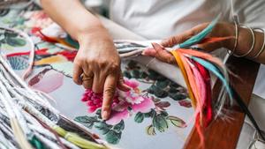 (250611) -- YANCHENG, 11 junio, 2025 (Xinhua) -- Imagen del 6 de junio de 2025 de una artista presentando diversas materias primas utilizadas para el bordado de cabello en la fábrica de bordado de cabello de Jiali, en la ciudad de Dongtai, en Yancheng de la provincia de Jiangsu, en el este de China. El Bordado de Cabello de Dongtai, que se originó de la costumbre popular de utilizar cabellos humanos como hilo para bordar a Buda en la dinastía Tang (618-907) de China, tiene una historia de más de 1.300 años. (Xinhua/Tao Liang) (ra) (vf)