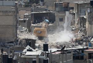 (250611) -- TULKARM, 11 junio, 2025 (Xinhua) -- Una excavadora israelí demuele una casa perteneciente a palestinos durante una operación israelí en el campamento de refugiados de Tulkarm, en el norte de Cisjordania, el 11 de junio de 2025. La Oficina para la Coordinación de Asuntos Humanitarios de la ONU dijo que las operaciones israelíes se intensificaron en los campamentos de Tulkarm y Nur Shams desde el viernes, coincidiendo con el festival de Eid al-Adha. Las fuerzas ejecutaron órdenes de demolición de 58 estructuras. La agencia de ayuda de la ONU para los refugiados de Palestina informó que más de tres docenas de edificaciones fueron demolidas, y que la destrucción se extendió más allá de las órdenes originales anunciadas a principios de junio. (Xinhua/Nidal Eshtayeh) (jg) (da) (vf)