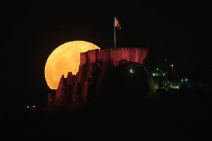 (250611) -- ANKARA, 11 junio, 2025 (Xinhua) -- La luna llena aparece sobre el Castillo de Ankara, en Ankara, Turquía, el 11 de junio de 2025. (Xinhua/Mustafa Kaya) (ra) (ce)