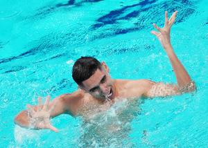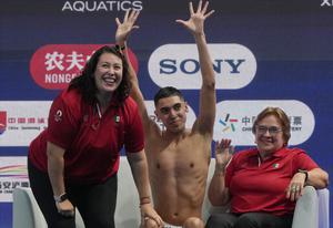(250613) -- XI'AN, 13 junio, 2025 (Xinhua) -- Diego Villalobos Carrillo (c), de México, festeja durante el evento solo técnico...