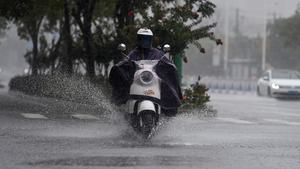 (250614) -- BEIHAI, 14 junio, 2025 (Xinhua) -- Un ciudadano circula en medio de fuertes lluvias, en la ciudad de...