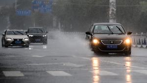 (250614) -- BEIHAI, 14 junio, 2025 (Xinhua) -- Vehículos circulan en medio de fuertes lluvias, en la ciudad de Beihai,...