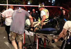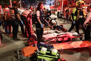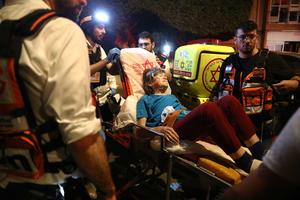 (250615) -- BAT YAM, 15 junio, 2025 (Xinhua) -- Rescatistas transportan a una persona herida en ataques con misiles iraníes,...