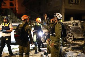 (250615) -- BAT YAM, 15 junio, 2025 (Xinhua) -- Socorristas israelíes trabajan en un sitio alcanzado por un misil disparado...