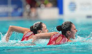 (250614) -- XI'AN, 14 junio, 2025 (Xinhua) -- Marla Fernanda Arellano Germes/Itzamary González Cuéllar, de México, compiten durante la final...
