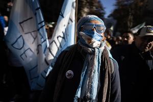 (250618) -- BUENOS AIRES, 18 junio, 2025 (Xinhua) -- Una persona con el rostro cubierto participa en una manifestación masiva...