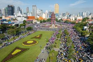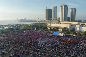 (250618) -- PHNOM PENH, 18 junio, 2025 (Xinhua) -- Vista aérea tomada con un dron de personas asistiendo a una...