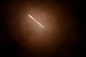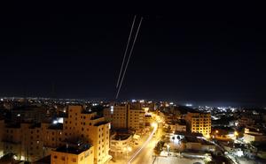 (250618) -- HEBRON, 18 junio, 2025 (Xinhua) -- Rastros de misiles son vistos desde la ciudad de Hebrón, en el...
