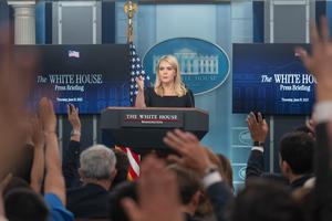 (250619) -- WASHINGTON, 19 junio, 2025 (Xinhua) -- La secretaria de prensa de la Casa Blanca, Karoline Leavitt, sostiene una...