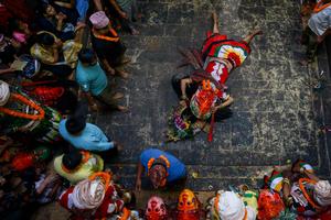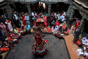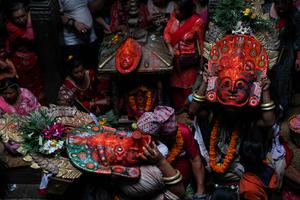 (250619) -- BHAKTAPUR, 19 junio, 2025 (Xinhua) -- Imagen del 18 de junio de 2025 de bailarines enmascarados vistos durante...