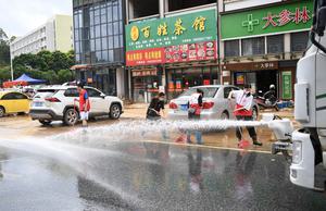 (250619) -- HUAIJI, 19 junio, 2025 (Xinhua) -- Voluntarios limpian una calle afectada por la inundación, en el distrito de...