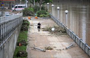 (250619) -- HUAIJI, 19 junio, 2025 (Xinhua) -- Instalaciones son dañadas por las inundaciones en la ribera de un río,...