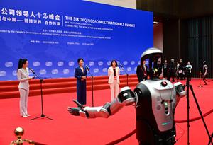 (250620) -- QINGDAO, 20 junio, 2025 (Xinhua) -- Imagen del 19 de junio de 2025 de un robot humanoide haciendo preguntas en la VI Cumbre de Multinacionales de Qingdao, en Qingdao, en la provincia de Shandong, en el este de China. La ceremonia de apertura de la VI Cumbre de Multinacionales de Qingdao se celebró el jueves en Qingdao. (Xinhua/Li Ziheng) (jg) (da) (vf)