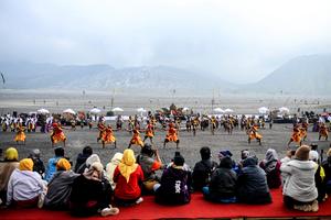 (250621) -- PROBOLINGGO, 21 junio, 2025 (Xinhua) -- Personas observan una presentación de danza durante el Eksotika Bromo 2025 en...