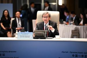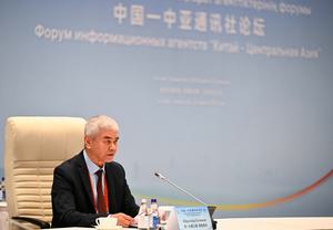 (250622) -- ASTANA, 22 junio, 2025 (Xinhua) -- Mederbek Shermetaliev, director de la Agencia de Noticias Kabar de Kirguistán, pronuncia...