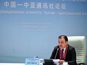 (250622) -- ASTANA, 22 junio, 2025 (Xinhua) -- Subhiddin Shamsiddinzoda, director de la Agencia de Noticias Khovar de Tayikistán, pronuncia...