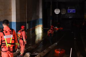 (250620) -- LONGSHAN, 20 junio, 2025 (Xinhua) -- Bomberos drenan el agua en un garaje subterráneo de un complejo residencial,...