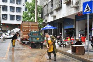 (250620) -- LONGSHAN, 20 junio, 2025 (Xinhua) -- Propietarios de tiendas limpian la calle tras las fuertes lluvias, en el...