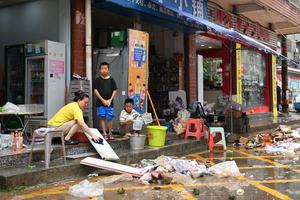 (250620) -- LONGSHAN, 20 junio, 2025 (Xinhua) -- Propietarios de tiendas limpian sus negocios tras las fuertes lluvias, en el...