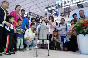(250622) -- KUNMING, 22 junio, 2025 (Xinhua) -- Personas observan la presentación de un perro robótico durante la IX Exposición...
