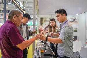 (250620) -- KUNMING, 20 junio, 2025 (Xinhua) -- Un expositor (d) de Panamá sirve café a los visitantes en el...
