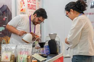 (250620) -- KUNMING, 20 junio, 2025 (Xinhua) -- Un expositor (i) de El Salvador prepara café para una visitante en...