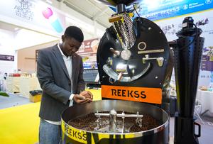 (250620) -- KUNMING, 20 junio, 2025 (Xinhua) -- Un expositor de Nigeria revisa la condición de tostado de granos de...