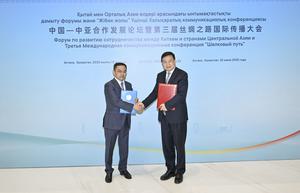 (250622) -- ASTANA, 22 junio, 2025 (Xinhua) -- El presidente de la Agencia de Noticias Xinhua, Fu Hua, intercambia un...