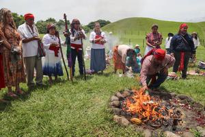 (250622) -- LA LIBERTAD, 22 junio, 2025 (Xinhua) -- Líderes de comunidades indígenas participan en la celebración del solsticio de...