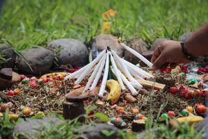(250622) -- LA LIBERTAD, 22 junio, 2025 (Xinhua) -- Una persona entrega una ofrenda en un altar de fuego durante...