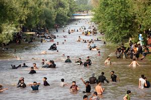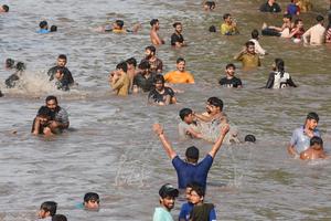 (250621) -- LAHORE, 21 junio, 2025 (Xinhua) -- Imagen del 20 de junio de 2025 de personas refrescándose durante una...