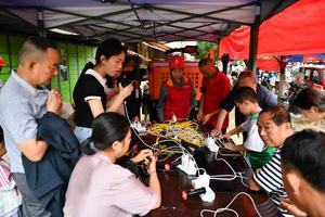 (250621) -- LONGSHAN, 21 junio, 2025 (Xinhua) -- Ciudadanos cargan sus dispositivos en un refugio temporal, en el distrito de...
