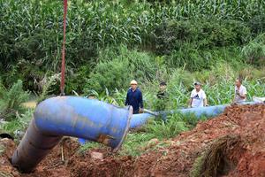 (250621) -- LONGSHAN, 21 junio, 2025 (Xinhua) -- Trabajadores instalan tuberías de suministro de agua, en el distrito de Longshan,...