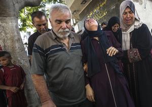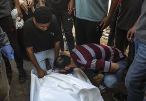 (250624) -- GAZA, 24 junio, 2025 (Xinhua) -- Palestinos se lamentan por una víctima asesinada en un sitio de distribución...